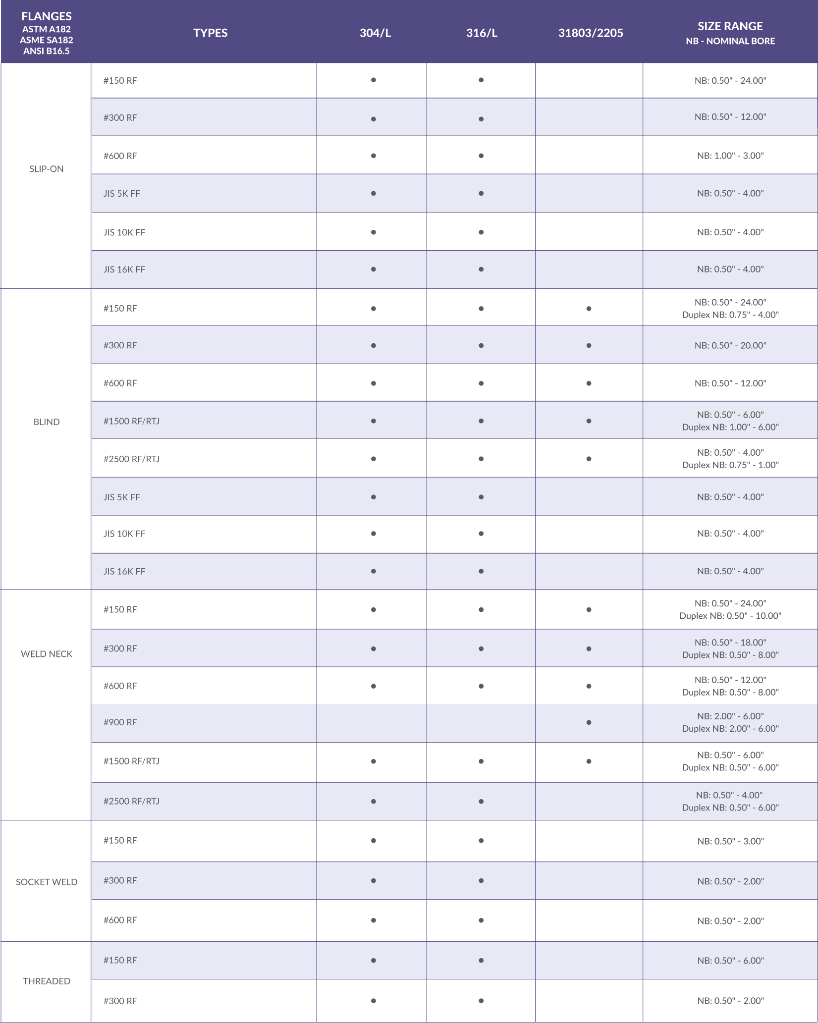 These flanges are bored to match the inside diameter of the mating pipe or fitting so there will be no restriction of product flow. This prevents turbulence at the joint and reduces erosion. They also provide excellent stress distribution through the tapered hub and are easily radiographed for flaw detection